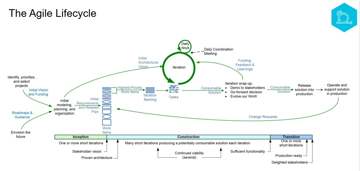 Übersicht zum lifecycle „Agile“ inklusive der Phasen Inception Phase, Construction Phase, Transition Phase.