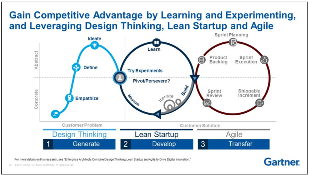 Hier können die Methoden Design Thinking zum Lösen von Problemen und zur Entwicklung neuer Ideen, Lean Startup zur Umsetzung von Geschäftsideen durch Anwendung von schlanken Prozessen und Lernen durch iteratives und kundenzentriertes Testen sowie Agile Methoden mit iterativen, inkrementellen, flexiblen, adaptiven Ansätzen, die Teams bei Projektmanagement/ Produktentwicklung helfen ihren Kunden/Nutzern schneller und reibungsloser Mehrwert zu bieten.