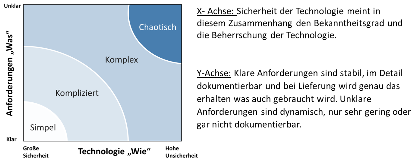 Eine Orientierung für welche Projektarten welche Projekt-/Produktentwicklungsansätze sinnvoll sein können, gibt uns die Stacey-Komplexitäts-Matrix3:
