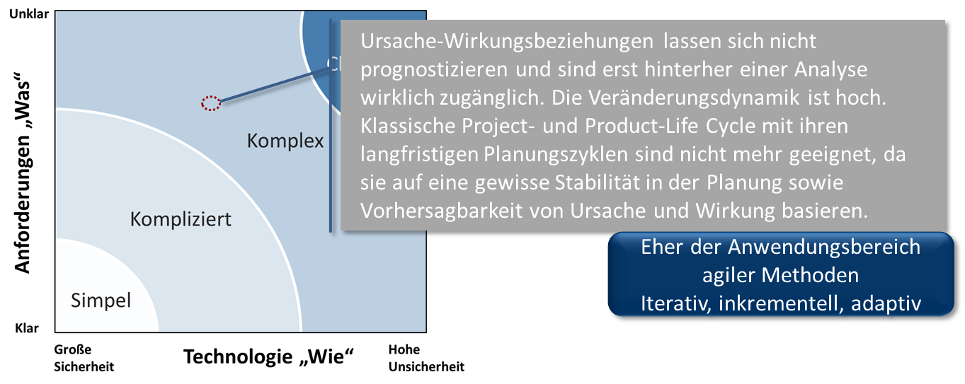 Hier stehen die klassischen Projektmanagement-Inhalte im Fokus. Sie bauen auf eine relative Planungssicherheit auf. Die Aufgabenstellungen können komplizierter Natur sein. Die Anforderungsdynamik ist hier aber beherrschbar. Problematisch ist die Situation, wenn neue Anforderungen zu einem späten Zeitpunkt im Projekt hinzukommen. Das ist häufig sehr aufwändig, teuer und zeitintensiv. Die eingesetzten Technologien sind größtenteils gut bekannt und beherrschbar.