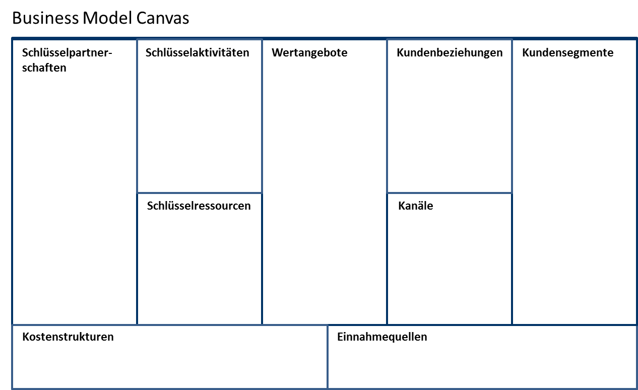 Entwicklung, Analyse, Design und Kommunikation von Geschäftsmodellen mit Hilfe des visuellen Werkzeugs Business Model Canvas mit seinen 9 essenziellen Bausteinen, durch die jedes Business Modell beschrieben werden kann.